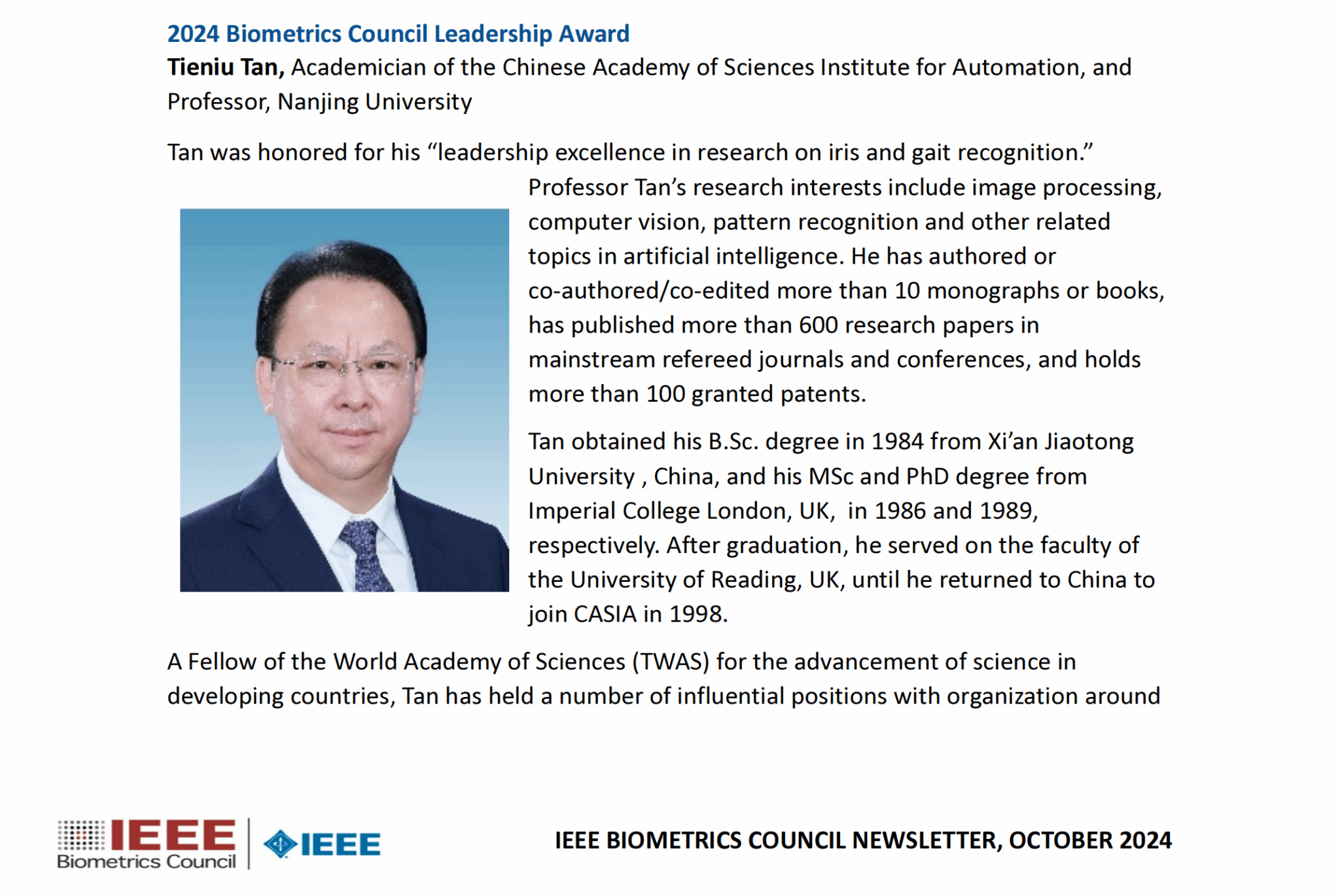 谭铁牛院士荣获2024年“IEEE生物识别理事会领导力奖”