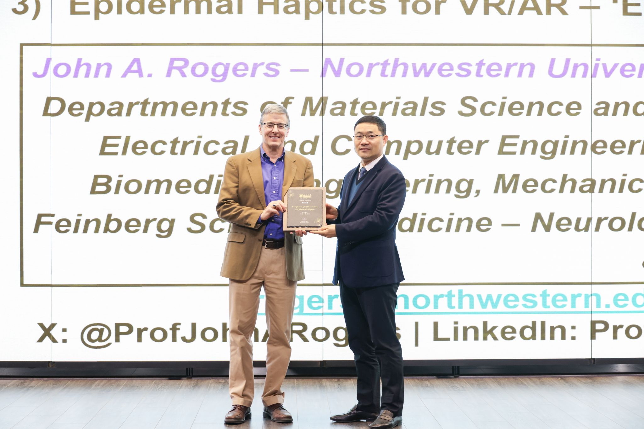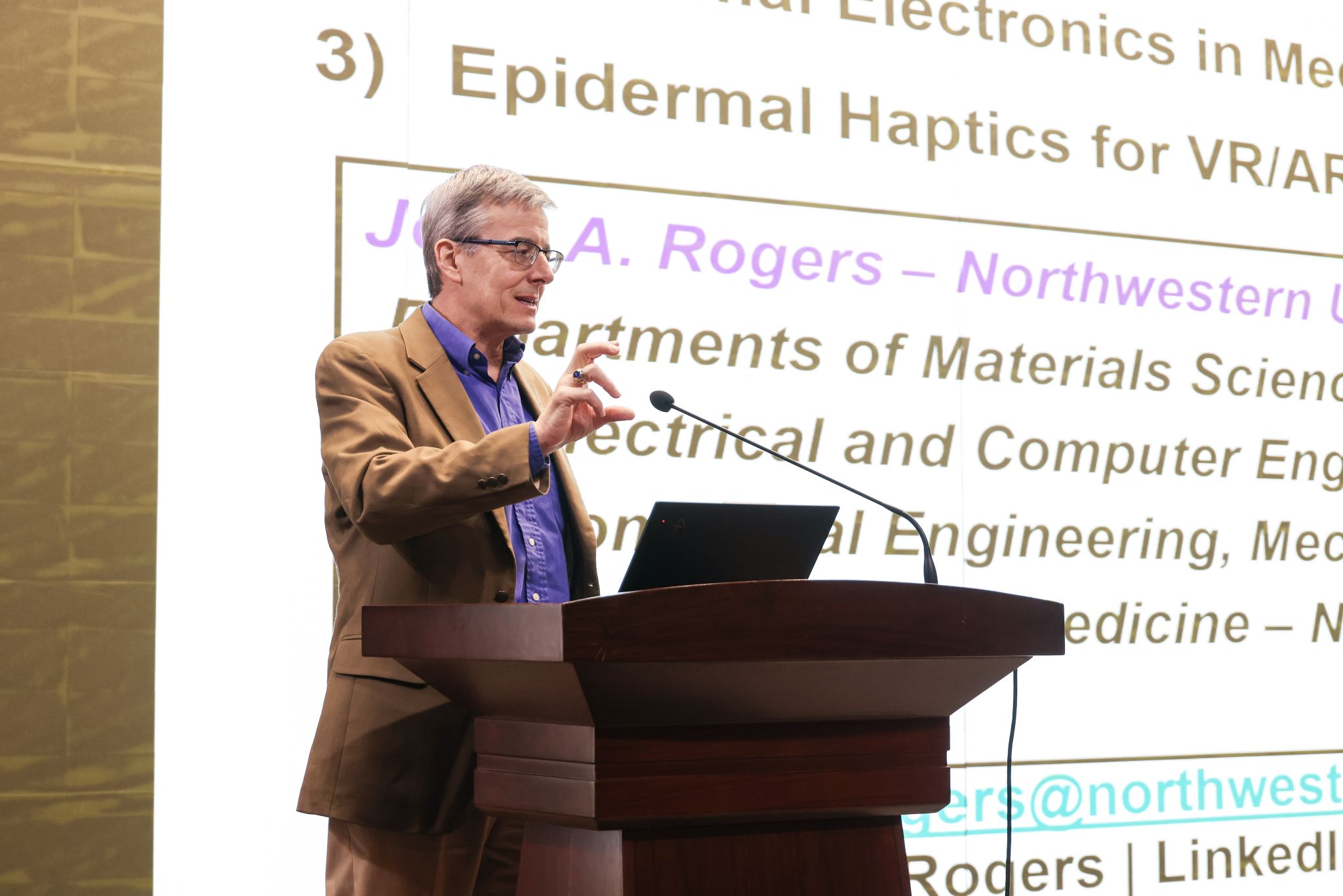 罗杰斯以“柔性电子器件在人体健康监测中的应用(Flexible Electronics for the Human Body)”为题作主旨报告。在报告中,他深入阐述了材料科学、机械工程、电气工程与先进制造领域在过去十年中的深度融合,这一趋势催生了众多新型“生物相容性”电子系统。这些系统具备类似皮肤的物理特性,不仅有重要且独特的功能,还在健身、健康监测、运动表现评估、临床医疗保健以及虚拟现实环境等多个领域展现出巨大潜力,为诊断、治疗及传感设备的研发开辟了广阔空间。罗杰斯不仅详细讲解了这些关键概念,还展示了最新的应用实例,例如,无线、无电池的电子“纹身”技术,已被广泛应用于美国顶尖医院及非洲多国诊所,用于持续监测新生儿和儿科重症监护患者的生命体征。此外,他还介绍了可编程的振动触觉界面,这一技术能够支持实时的患者反馈,并显著提升虚拟现实环境中的用户体验。