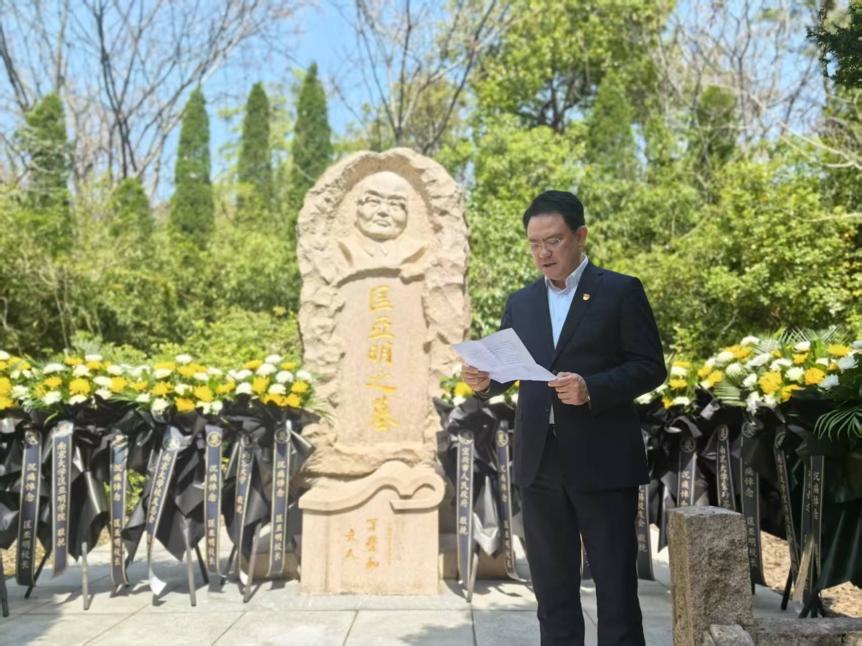 活动伊始,全体在匡亚明校长墓碑前庄严肃立,沉重默哀,敬献花篮,三鞠躬,深切缅怀匡亚明校长。