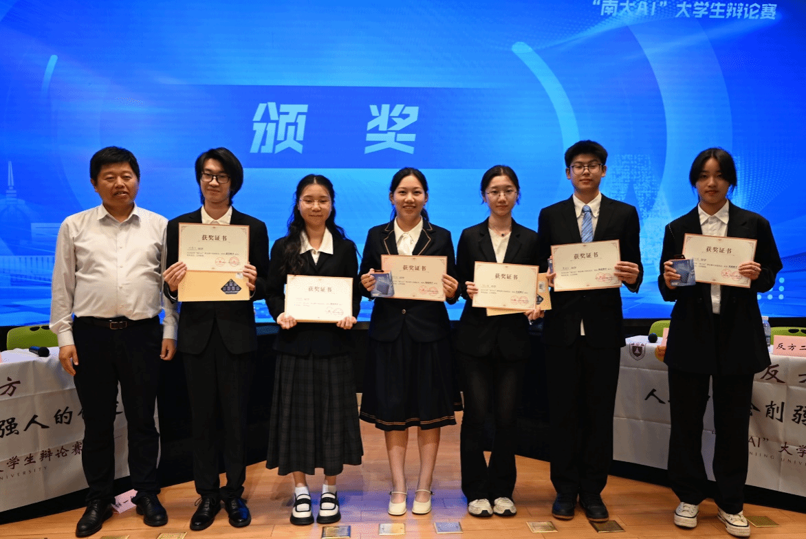 陆现彩为“最佳辩手”叶逸飞同学颁奖,并为所有辩手颁发证书。