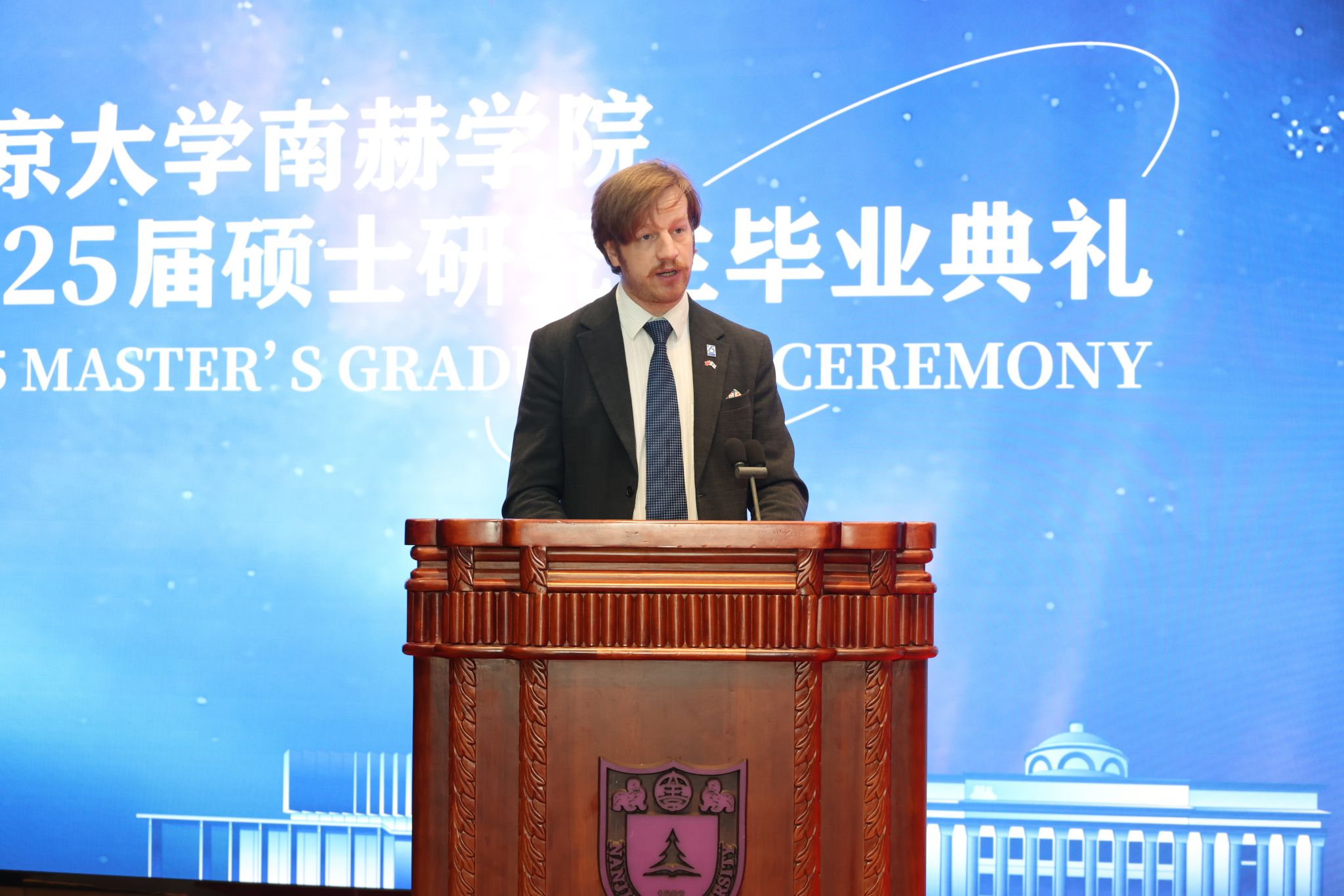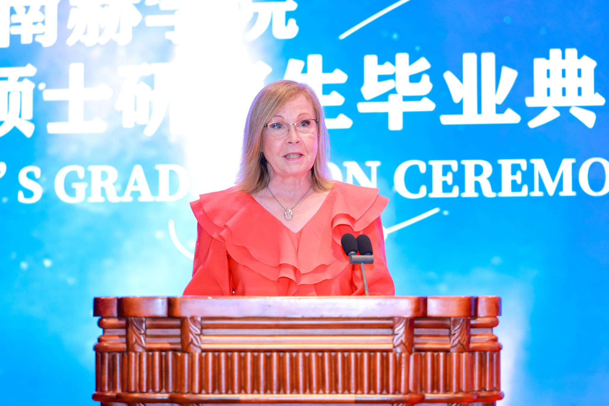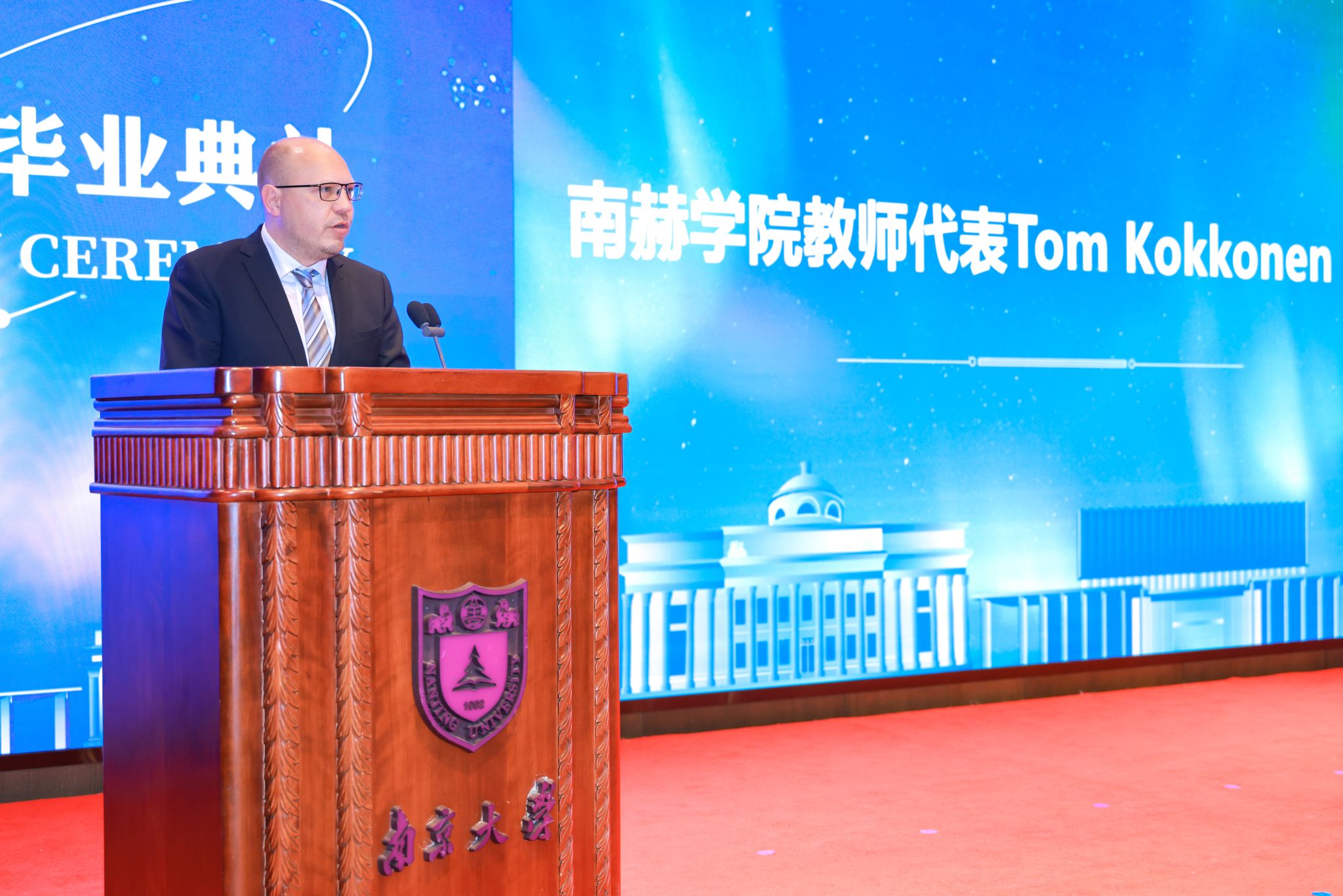 林德布洛姆向首届毕业生致以衷心的祝贺,向凯发k8官网和赫尔辛基大学的教职员工表达深切谢意。她表示,作为南赫学院的首届毕业生,同学们在南赫学院展现了远见与伙伴精神,同时也承载着非凡的历史性意义。首届毕业生顺利毕业不仅是个人学术生涯的高光时刻,更是两校合作办学结出的首枚硕果。当今世界正迫切需要青年一代以独到的洞察视角回答解决气候危机、资源短缺等时代议题,在全球治理的舞台上书写属于这代人的责任答卷。她勉励全体毕业生在面对气候危机、全球污染等时代议题时充分运用在南赫学院所学的知识,保持创新精神,勇敢迎接挑战,积极为应对全球性议题贡献南赫智慧与力量。