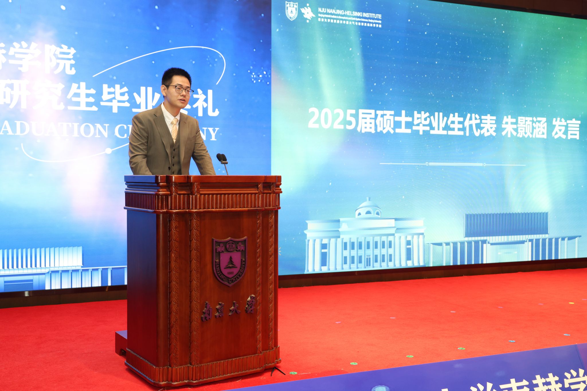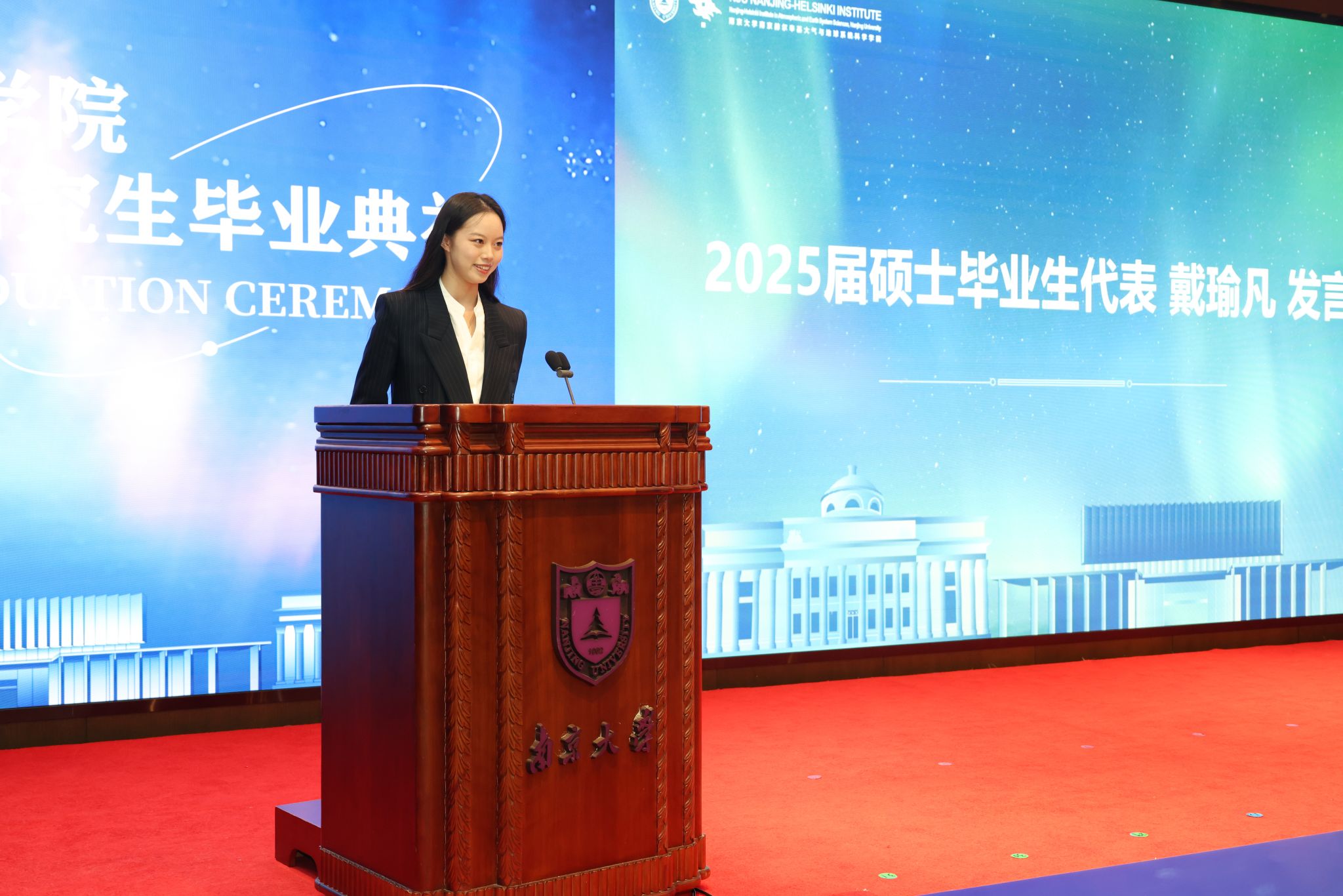 毕业生代表戴瑜凡和朱颢涵先后分享了自己在南赫学院的求学经历,并表达了对南赫学院的感恩之情。他们表示将从这里出发,带着“南赫人”的热爱与芬兰SISU精神,驶向更广阔的蓝天。