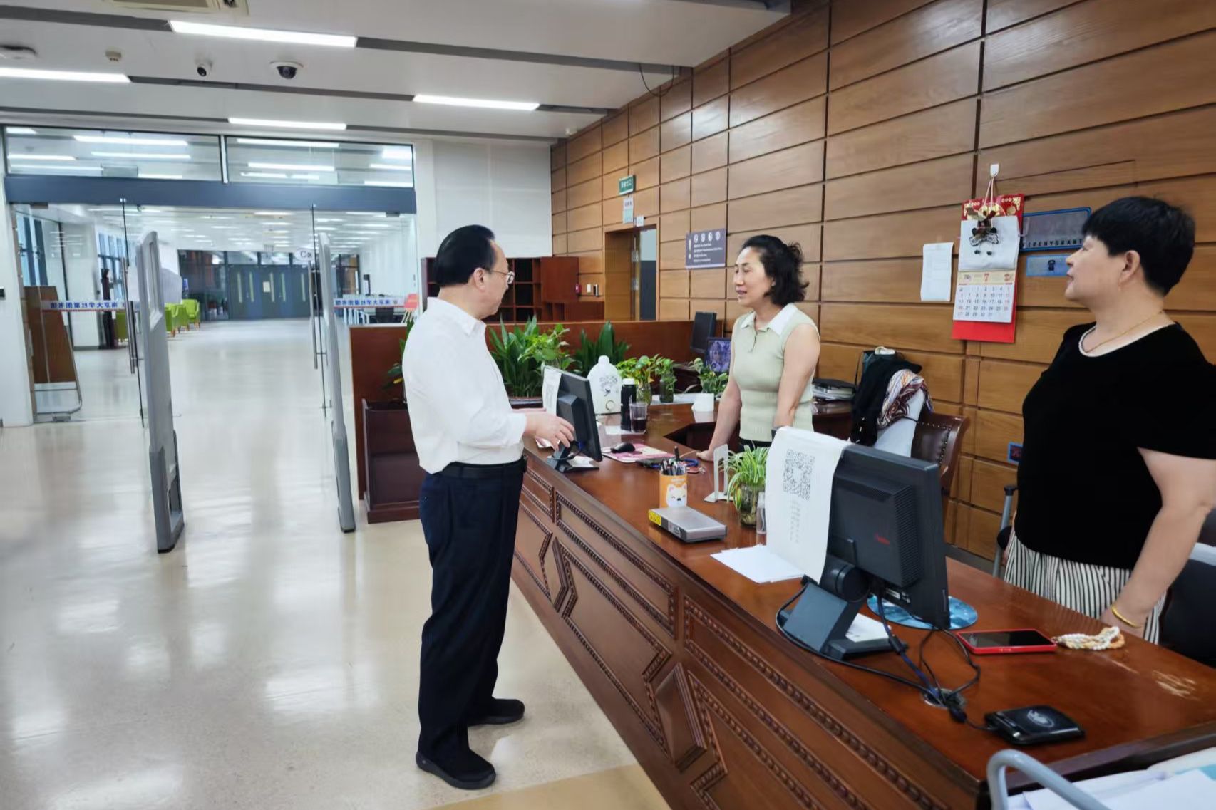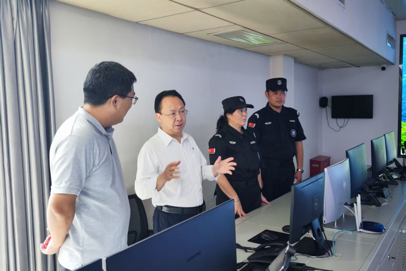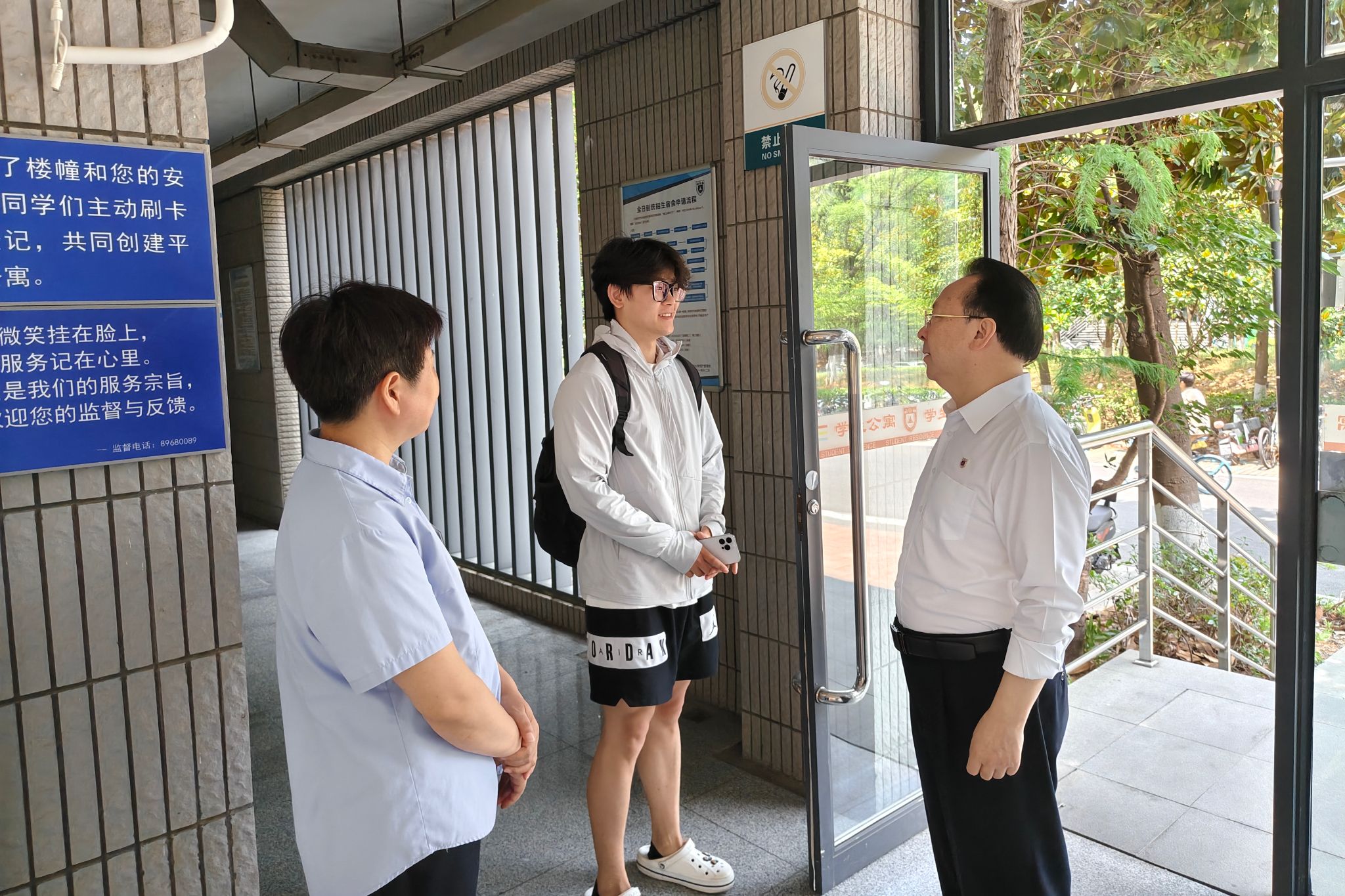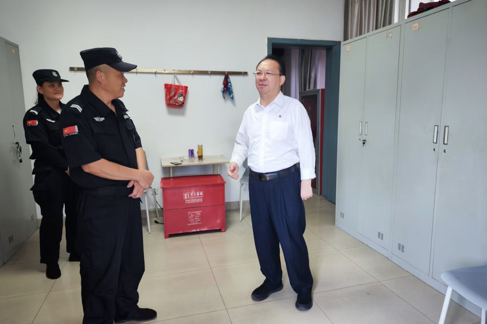 在仙林校区南门岗亭,谭铁牛同坚守岗位的保卫人员及预约入校参观的游客亲切交流,他详细询问了保卫人员值班排班情况并指出,要加强对高温户外工作人员的各项保障,确保岗亭空调设备运行正常。谭铁牛强调,暑假期间慕名而来的游客很多,保卫人员的形象关系到校外游客对凯发的第一印象,是凯发的“门面”。希望大家既以良好精神面貌把好门,又以耐心热情友好的态度同访客交流沟通,加强人性化管理。