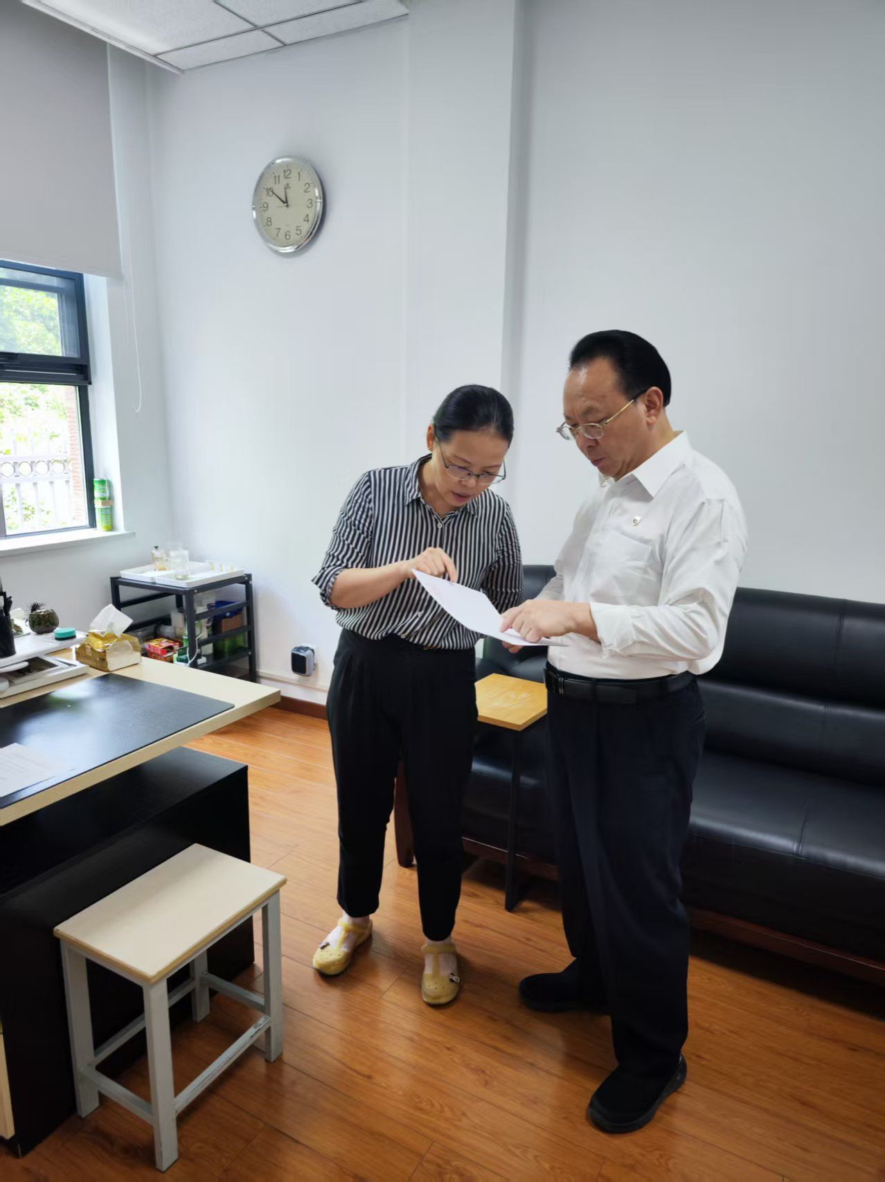 在和园学校工会办公室,谭铁牛详细了解工会的工作人员构成、办公环境、暑期值班等情况,并充分肯定了近期学校工会工作成效。