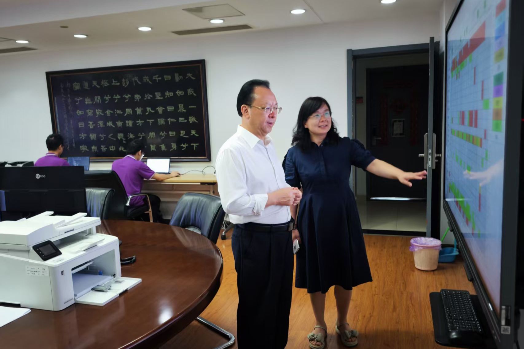 “要注意防暑”“别忘了吃饭”,在行政北楼3楼资产管理处办公室,谭铁牛亲切询问了暑期工作人员的工作生活情况,嘱咐他们要注意劳逸结合、防暑降温。在了解到暑期是学生宿舍匹配排位工作“高峰期”时,他强调,要进一步细化工作管理流程,将作息规律、生活习惯类似的学生匹配到一起,全力为学生提供优质服务。
