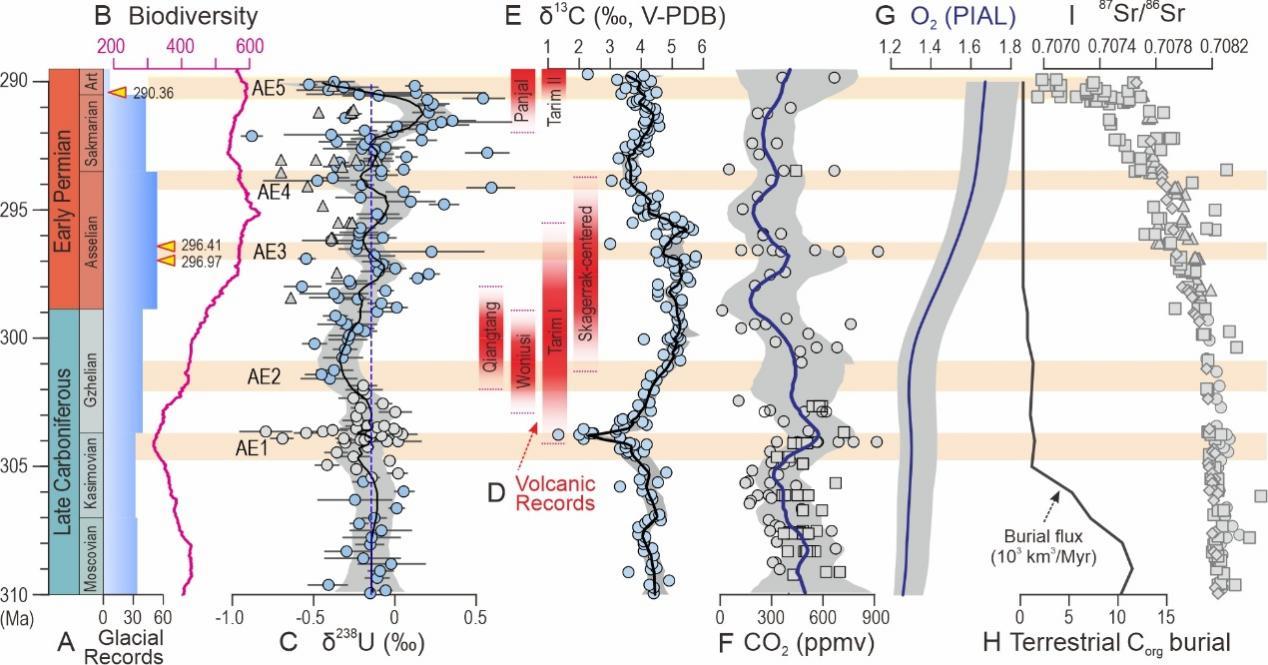 △ 晚石炭世–早二叠世地质事件、海洋生物多样性及地球化学记录。
