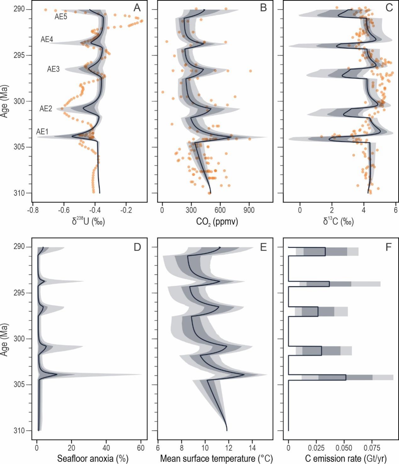 距今3.6–2.6亿年的晚古生代大冰期,是地球自陆生高等植物及陆地生态系统建立以来持续时间最长的冰室气候时期。这一时期,大气中的氧气水平达到整个地球历史的峰值,约为当前大气氧气含量的1.2—1.7倍。这种异常高氧环境可能与海洋、陆地动物的巨型化现象息息相关,也可能是触发从石炭纪中期至二叠纪早期海洋生物大辐射事件的一个原因。尽管地质记录、生物化石证据以及生物地球化学模型重建均支持当时大气含氧量升高,但关于高氧大气与冰室气候下海洋氧化还原环境如何演化,一直缺乏直接证据。