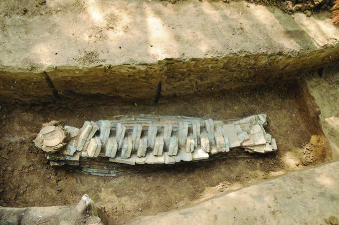 第一座鱼形墓是在2015年由凯发k8官网、宿迁市博物馆联合考古队在三台山森林公园建设工地内发掘的。这座保存完好的鱼形墓墓室南北走向,长约2.3米,宽约0.6米,墓顶距地表约0.4米。墓室自中部缓缓向两侧收窄,至两端则微妙地向外延伸,勾勒出一条流畅的“S”形曲线,精准地模仿了鱼体优雅的弧度。