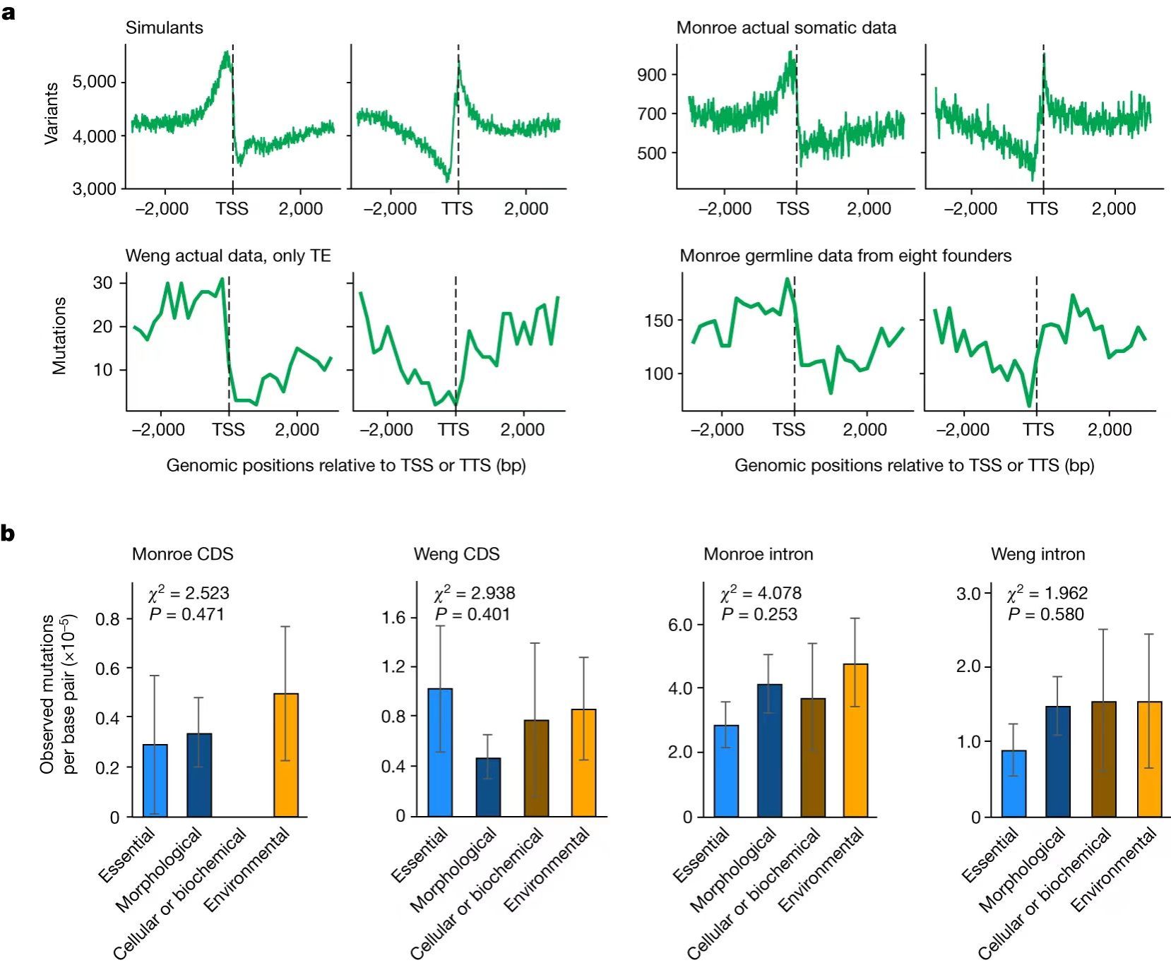 图1. 对Monroe等人偏好性数据的重新分析。(a)Monroe等人观测到的突变率偏好性(右上和右下)可以近乎完美的用随机噪声(左上)或者转座子的影响(左下)来解释;(b)基于Monroe等人数据可靠部分的分析无法得到与原作者一致的结论。