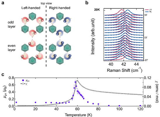 图1. a, 手征声子示意图;b,20K时P1声子的塞曼劈裂;c,声子磁矩随温度变化。