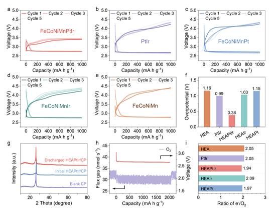 图1. (a-e) 五种合金催化剂在200 mA g-1,1000 mAh g-1的测试条件下的充放电曲线及(f) 在500 mAh g-1时相应LOB的过电位;(g) 空碳纸(CP)正极和放电前后HEAPtIr/CP正极的XRD衍射图谱;(h) 1000 mA g-1,2000 mAh g-1测试条件下HEAPtIr正极放电时的原位DEMS曲线;(i) 放电时五种合金催化剂的e-/O2比。