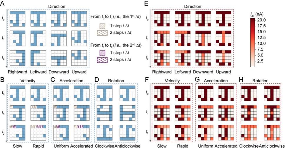 图3:输入图像的光强分布及其在器件阵列中的沟道电流(Ids)映射。(A-D)字母“J”在不同运动模式下的逐帧光强映射。每种模式由三帧组成(每帧光照时长为 50 ms),分别于t0、t1 和 t2 时刻投影到阵列上。在(A)中,物体在四个运动方向(右、左、下、上)以1步/Δt匀速运动。两个相邻帧之间的时间间隔被定义为单位时间(Δt),将两个相邻像素中心之间的距离定义为单位步长。以向右运动为例,物体可进行慢速(1步/Δt)或快速(2步/Δt)运动(图B),匀速或加速运动(图C),顺时针转动或逆时针转动(图D)。(E-H)不同运动模式(A-D)对应的器件阵列沟道电流Ids映射。图像“J”的原始状态在t0时刻被存储到器件阵列中,在t1 和 t2时刻测量每个器件的Ids(由从浅红色至深红色的像素亮度级别表示),从而形成与各个运动模式相对应的独特电流分布。所有测量均在 0 V 的背栅电压下完成。