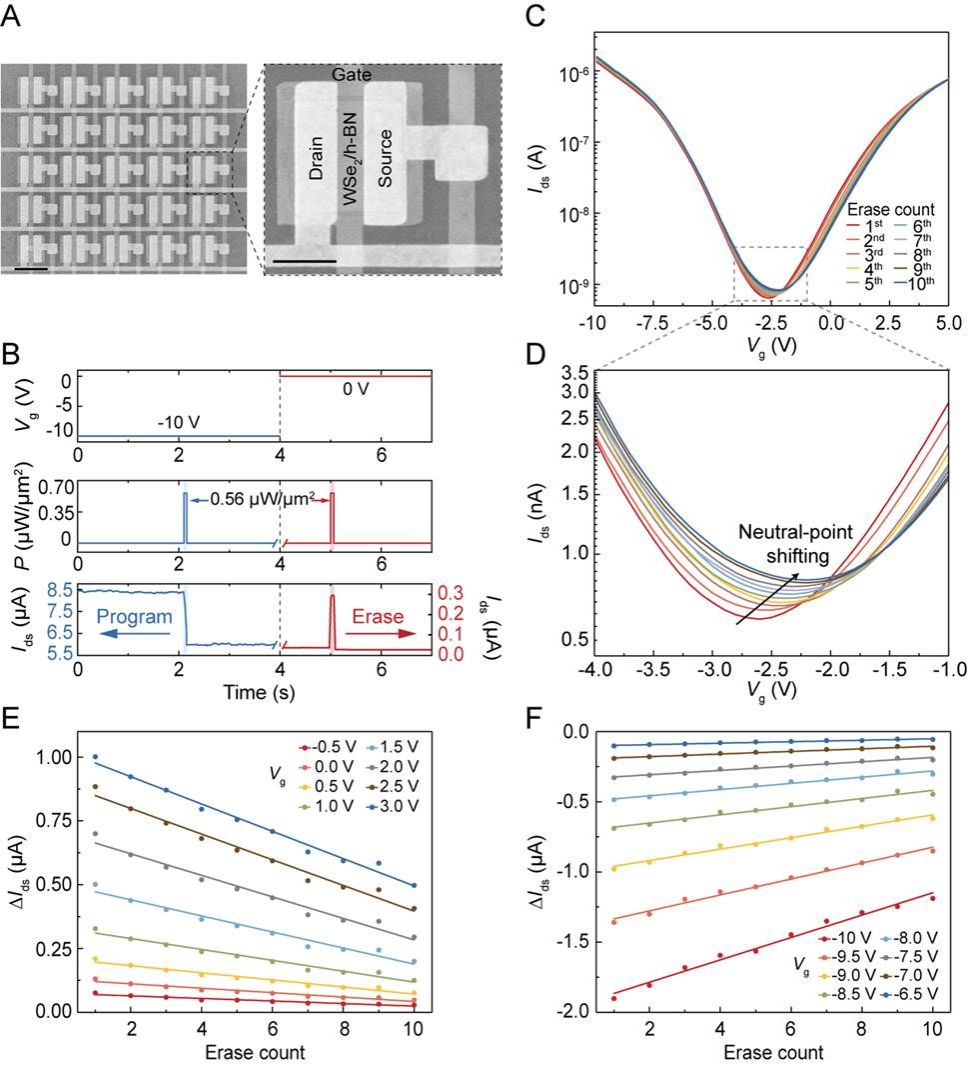 内的转移特性曲线,其中电中性点呈现出持续右移的变化趋势。(E-F)不同背栅电压下电流变化 (ΔIds) 与擦除次数之间的线性关系。ΔIds基于Vg的极性可正可负。所有测量均在 1.75 V 的偏压下完成。
