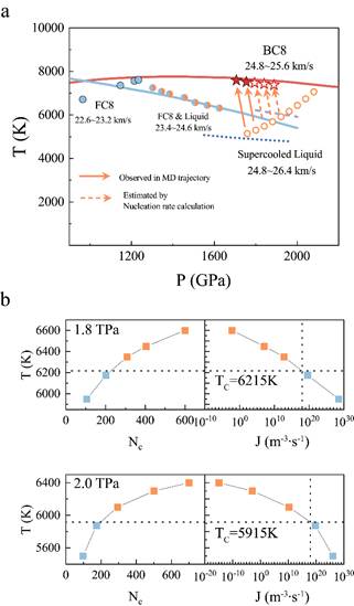 图3:(a) 第二次冲击压缩中,不同冲击速度下系统的所处的状态。(b) 经典成核理论框架下计算得到的临界核大小与成核率。