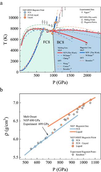 为了研究极端条件下碳的复杂行为,孙建课题组使用他们合作开发的GPUMD机器学习分子动力学方法 【Fan et al., J. Chem. Phys. 157, 114801 536 (2022)】 构建了针对高压碳的NEP(Neuro-evolution potential)机器学习力场,在GPU计算的助力下实现了接近第一性原理精度的大体系纳秒时间尺度模拟。基于该机器学习力场,他们对碳的熔化曲线,以及绝热冲击线进行计算,几乎完全复现了第一性原理计算的结果,并且与先前的理论和实验工作均吻合的很好。