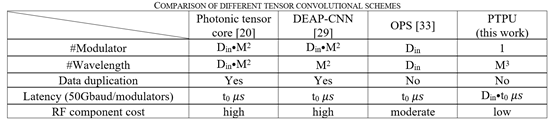 在这项工作中,研究团队提出了光子张量卷积处理器(PTPU),一种更简洁的多通道张量单通道化的光学卷积方案。根据所提出的算法规则,将高阶张量中不同通道的像素混合并重新排列为一维向量。然后,光学波长、空间和时间维度的混合操作使得能够在光学域中直接处理平坦的像素序列。因此,任意高阶张量的所有输入通道合并后只需要一个输入调制器,相关高速器件所占空间比OPS方案小几倍,成本也大幅度降低。