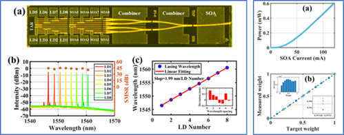 图2. 左栏:单片集成的DFB-SOA,以及激光阵列芯片表征数据;右栏:SOA权重精度表征数据。