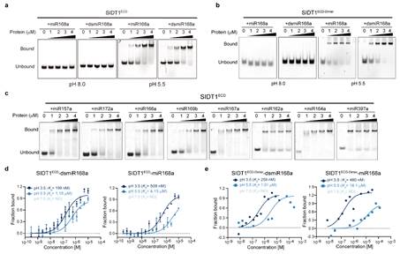 为了揭示SIDT1 和 SIDT2 介导小RNA 转运的分子机制,研究人员进一步探究了它们的 ECD 与小 RNA 的结合情况。实验结果显示,SIDT1 和 SIDT2 的 ECDs 能以 pH 依赖性方式有效地与小 RNA 结合。在酸性条件下,ECDs 与小 RNA 的结合亲和力增加,这种结合进一步引发了 ECDs 的寡聚化。这一发现推翻了前期报道的SIDT1ECD和SIDT2ECD只能结合较长的双链RNA(>100 bp)的观点。同时,研究人员还发现ECD蛋白在酸性条件下与核酸的结合不受核酸种类、单双链的特异性影响,并且这种结合存在pH依赖性。最后,通过分析型超速离心和凝胶过滤层析分析,研究团队还发现在酸性条件下,SIDT1和SIDT2与核酸结合能够诱导蛋白质的寡聚化,表明它们具有形成核酸孔道的潜力。该项研究揭示了低 pH 环境促进 SIDT1 和 SIDT2 吸收外源小 RNA的关键作用,加强了在低pH条件下促进小RNA的跨膜吸收的分子机制理论基础。
