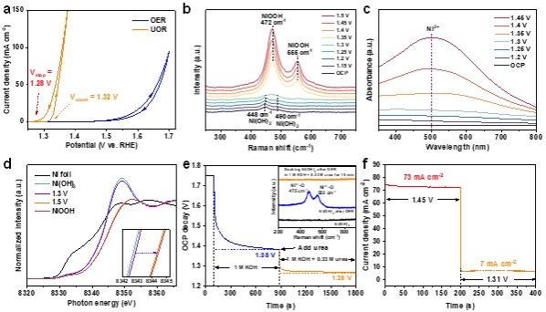 3. 非氧化还原三价镍作为尿素电氧催化中心的证据。(a)计时电流-电位数据拟合得到的线性扫描伏安曲线。(b-d)Ni(OH)2电极尿素电氧化的电位依赖的b)原位拉曼光谱,c)原位紫外-可见吸收光谱,d)原位镍K边X射线吸收近边结构谱。(e)Ni(OH)2电极开路电压在电解液注入尿素前后的多段衰减。(f)当阳极电位在1.45 V和1.31 V之间阶跃时电流密度变化。