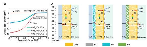 图1. (a) MoS2/CCZTS, MoS2/Pd/CCZTS 和 MoS2/Au/CCZTS异质结光电催化制氢性能,(b)基于传统能带排列理论的异质结界面电荷传输示意图。