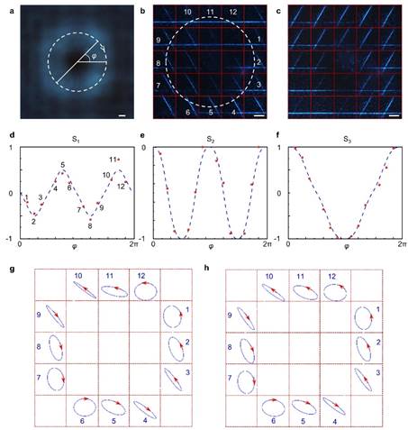 3. 空间非均匀偏振态的实验测量。(a)空间非均匀偏振光束的强度分布。 (b) (c)在不同圆偏振检偏下的焦面强度分布。(d)-(f) 基于神经网络推算的斯托克斯参量分布,虚线为设计值。(g) 神经网络推算的偏振态分布示意图。 (h) 设计的偏振态分布示意图。