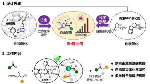 在自然界中,焦磷酸硫胺素依赖的苯甲醛裂解酶,催化的是双电子的(可逆的)苯甲醛到安息香的转化。受这一类酶的启发,合成化学家发展了一系列仿生氮杂环卡宾催化剂,并于近期用于催化自由基反应。综合利用仿生和化学模拟的思路(图1),研究团队利用可见光激发和定向进化手段,将ThDP依赖的苯甲醛裂解酶“重塑”为自由基酰基转移酶(RAT),实现了一例非天然的高对映选择性的自由基-自由基偶联反应。该成果首次将ThDP依赖酶用于催化非天然的自由基转化,同时实现了有机氮杂环卡宾催化不能达到的低催化剂负载量和高立体选择性的效果。