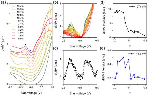 图4:超导体-金属-绝缘体转变过程中的谱权重演化。(a) 不同铁空位浓度的dI/d谱。(b) 从低铁空位浓度(N)区域到高铁空位浓度(D)区域采集的一系列dI/dV谱。(c) D区域的谱减去N区域的谱的强度差。(d),(e) 分别从(a)中黑色三角形和蓝色三角形标记的位置处提取的dI/dV强度。