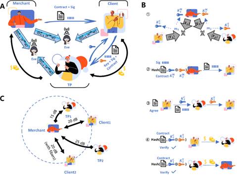 基于量子力学基本原理的量子信息科学被认为是提供信息安全所有要素的理想途径。基于量子密钥分发的量子保密通信可以确保消息机密性的无条件安全。而基于量子态传输的量子数字签名可以同时为信息的处理提供无条件安全的真实性、完整性和不可抵赖性。研究团队对如何构建高效安全的量子数字签名进行了近十年的研究。特别是在近两年通过发展一次性全域哈希(通用哈希)量子数字签名[Natl. Sci. Rev. 10, nwac228 (2023); Phys. Rev. Applied 20, 044011 (2023)],将长消息的签名效率提升了八个数量级以上。在此次研究中,研究团队将量子数字签名作为一个底层技术,通过含噪声量子态的隐私特性、一次性全域哈希函数的单向性和秘密共享的非对称特性而构建了一个无条件安全的量子电子商务协议,如图2所示。