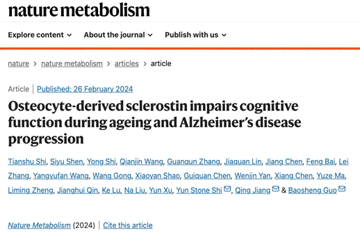 2024年2月26日,凯发k8官网医学院郭保生、蒋青及石云团队在Nature Metabolism在线发表题为“Osteocyte-derived sclerostin impairs cognitive function during ageing and Alzheimer’s disease progression”的研究成果,该研究发现在衰老和AD进展过程中,骨细胞分泌的硬化蛋白(Sclerostin, SOST)可以穿过老年小鼠的血脑屏障结合于神经元的LRP6受体,导致Wnt/β-catenin通路功能障碍,通过LRP6/β-catenin/β-secretase(BACE1)信号传导增加Aβ蛋白产生,从而加重认知功能损伤。凯发k8官网医学院郭保生教授、蒋青教授和石云教授为本文通讯作者;凯发k8官网医学院博士研究生石天舒、沈思虞和施勇为论文的共同第一作者。该研究获得国家自然科学基金重大项目、国家重点研发计划等各类项目支持。
