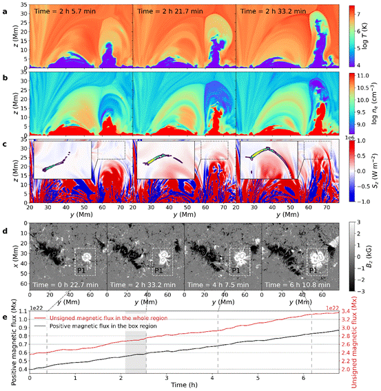 图3:太阳活动区磁流浮现过程中温度、数密度、坡印廷能流与光球层磁场随时间的演化,清楚展示了磁场持续在光球层浮现并将能量传输至高层大气的过程。