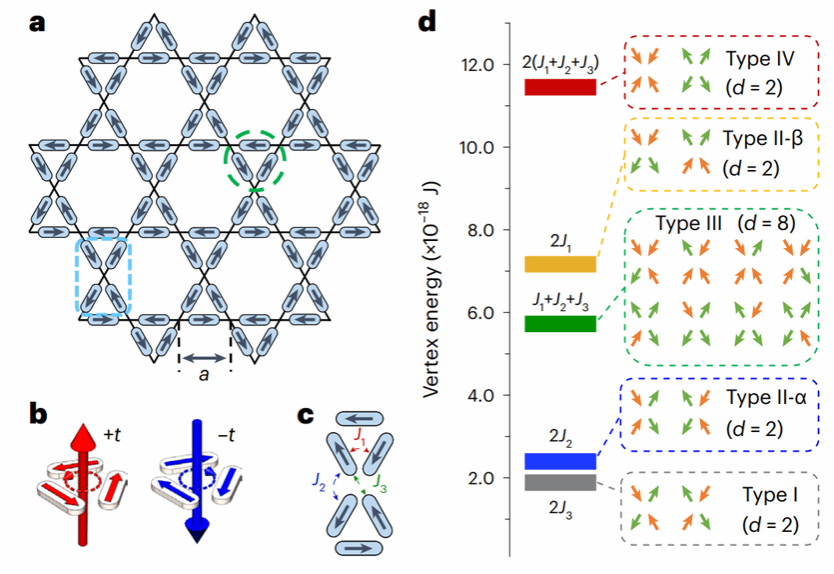 图2. 具有准兼并态的直接笼目型人工自旋冰(a)直接笼目型人工自旋冰几何结构;(b)三个纳米磁体单元形成的两种不同极性的铁涡矩;(c)三角单元之间小磁体的局部耦合;(d)基于能量大小的顶点类型分类,Type I和Type II-α较小的能量差诱导出准兼并态。