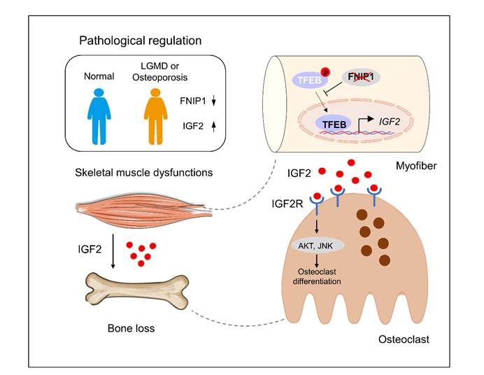 该研究发现了一个全新的肌-骨对话轴介导肌源性骨质丢失发生;揭示了IGF2作为促破骨肌肉分泌因子新的重要功能;提出了FNIP1-TFEB-IGF2信号轴是肌肉疾病和骨质疏松症的潜在干预靶标。