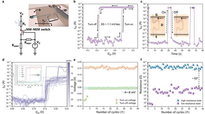 图1:纳米线基纳米机电(NW-NEM)开关的设计和工作原理。