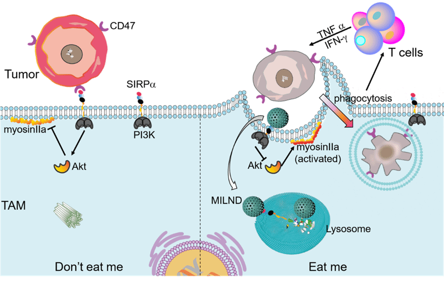 另一方面,鉴于CD47/SIRPα免疫检查点在巨噬细胞介导的“别吃我”信号通路中发挥的重要作用,课题组利用可控印迹包覆策略,以SIRPα N-端表位为靶标,制备一种巨噬细胞靶向分子印迹溶酶体降解剂用于抗肿瘤免疫治疗(图2)。制备的MILND原位特异性识别肿瘤相关巨噬细胞表面的SIRPα。随后,MILND-SIRPα复合物以胞吞方式转移至溶酶体降解,激活PI3K/Akt信号通路,最终触发巨噬细胞介导的抗肿瘤免疫应答。此外,吞噬细胞呈递的肿瘤抗原也有效促进T细胞活化及其介导的肿瘤杀伤。这一研究成果近期发表在Nano Today杂志上。我校化学化工学院21级博士生韩延杰为文章的第一作者,刘震教授为文章的通讯作者。