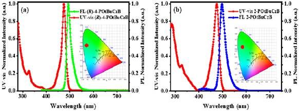 图3. 4-POtBuCzB和2-POtBuCzB的吸收和发射光谱