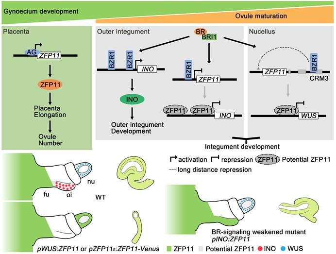 生命科学学院孙博课题组报道了拟南芥中BR信号通路和转录因子AG组织特异性调控C2H2型锌指蛋白ZFP11(ZINC FINGER PROTEIN11)表达以促进雌蕊和胚珠发育的分子机制。该研究通过对ZFP11的突变体、过表达植株和转基因回补系的分析,结合相关分子和细胞生物学实验结果,发现花发育第7期的雌蕊胎座组织中AG激活ZFP11表达,ZFP11促进胎座伸长以产生足够数量的胚珠;在胚珠发育过程中,ZFP11的表达被限制在珠柄中以维持胚珠的正常发育。进一步分析表明,BR信号下游转录因子BZR1(BRASSINAZOLE-RESISTANT 1)除了直接激活外珠被调控关键基因INO(INNER NO OUTER)表达以外,还结合到ZFP11启动子上并沉默其在外珠被的表达;珠心区ZFP11的表达则由位于下游的3’调控元件和相应的转录因子(如BZR1)抑制。在BR减弱的突变体或者pINO:ZFP11-eGFP转基因植株中,外珠被异位表达的ZFP11下调INO表达水平,造成外珠被发育缺陷;而在3’元件缺失的转基因材料或者pWUS:ZFP11-eGFP转基因植株中,ZFP11在珠心区异位表达并沉默WUS,造成更加严重的珠被和胚囊发育缺陷。