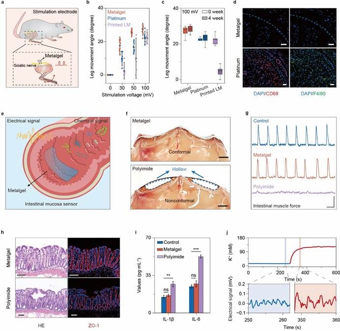 金属凝胶的独特结构和性质使其成为生物电子器件,尤其是植入式电极的理想选择(图4)。金属凝胶在被用作坐骨神经电刺激电极时表现出优异的刺激性能和生物相容性。此外,金属凝胶可以适应更复杂器官如肠道的应用需求,能够紧密贴合不规则肠道表面并跟随蠕动,连续准确地监测肠道电信号和离子浓度。此外,金属凝胶在电磁干扰屏蔽和气密性封装应用领域也展现广阔的前景。因其特殊的结构,金属凝胶能够在100%应变范围内保持稳定的电磁屏蔽效能和气体屏蔽性能,显示出巨大的应用优势。