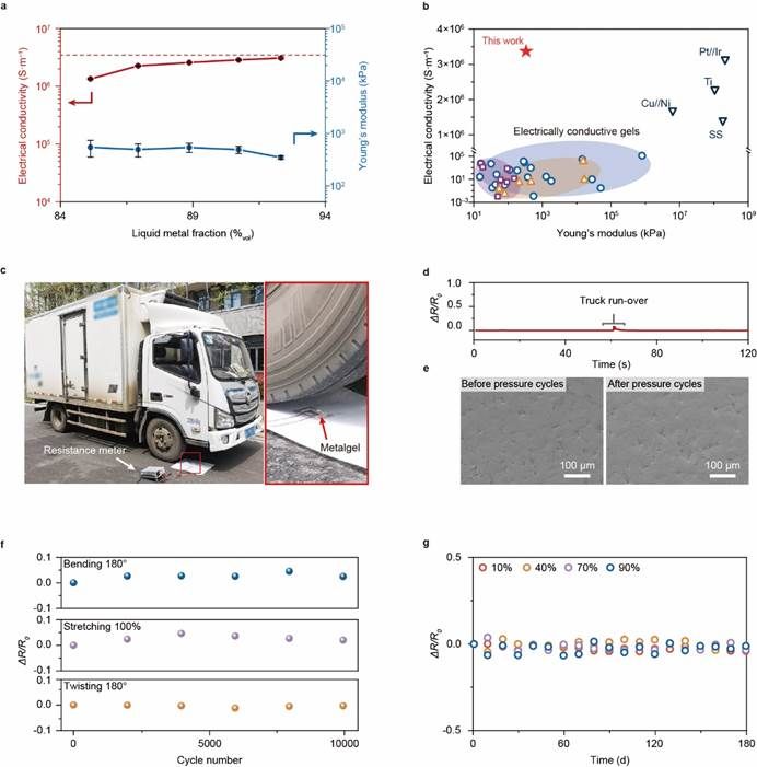 金属流体的引入为金属凝胶带来了前所未有的新性能(图2)。电子电导率高达3.18 × 106 S·m?1,与传统金属在同一数量级,显著高于其他导电凝胶材料。同时,杨氏模量低至70 kPa,与人体软组织的模量相匹配。此外,金属凝胶还展示出优异的稳定性,一辆4.5吨重的卡车从金属凝胶样品上碾过,依然可以保持其结构和性能,电阻仅增加了9%。在经历10,000次的反复弯曲、拉伸和扭转等变形下,电阻基本保持不变。