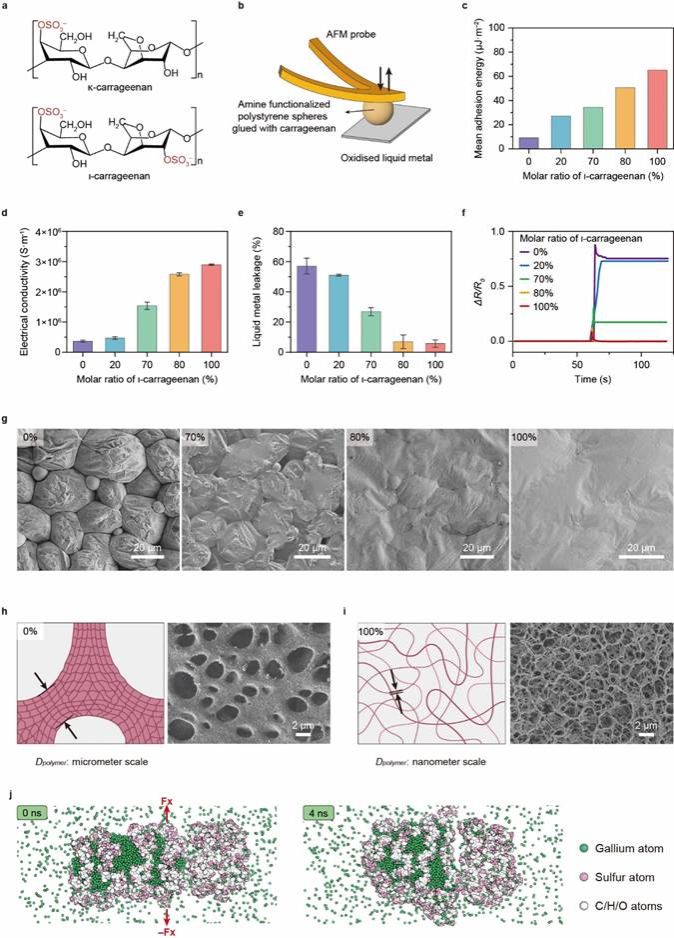 实现金属凝胶独特结构和优异性能的关键是液态金属与聚合物网络之间的相互作用(图3)。研究团队通过调整聚合物侧链上极性基团来改变静电相互作用,通过对比实验结合原子力显微镜的力谱分析和分子动力学模拟发现不同的静电相互作用会显著影响金属凝胶的形成及性能的稳定。增强的相互作用会导致嵌入凝胶中的液态金属相连续稳定,从而实现金属级的电导率,与此同时,金属凝胶中的静电相互作用还使其在不同环境中具有优异的稳定性,承受各种复杂变形而不发生泄露,在空气、水和高湿度条件下保持稳定。