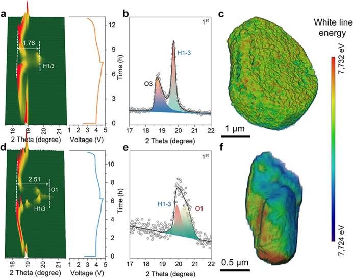 图2. 在4.75 V时正极材料的结构演变及脱锂均匀性分析。(a) P-LCO和(d) LCO正极在3.0 V至4.75 V电压范围内的首次充放电过程中原位X射线衍射(XRD)图谱及其对应的电化学曲线。(b) P-LCO和(e) LCO正极在充电至4.75 V时的XRD图谱。(c) 充电状态下的P-LCO和(f) LCO正极颗粒的TXM-XANES 映射图。