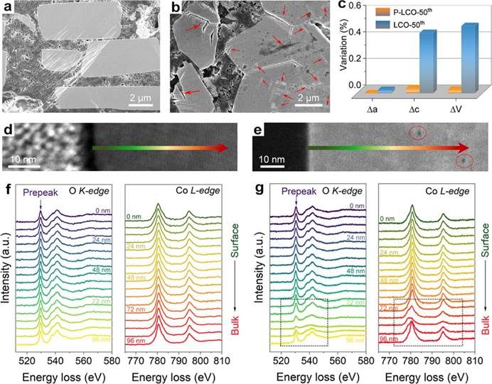 图3. 4.75 V电化学循环后正极材料的形貌与结构变化分析。(a) 循环后的P-LCO电极和(b) 循环后的LCO电极的横截面SEM图像。(c) P-LCO和LCO电极在4.75 V高压下循环50圈后晶格参数变化的对比。(d, f) 循环后的P-LCO正极颗粒,以及(e, g) 循环后的LCO正极颗粒,从表面到体相的O K-edge和Co L-edge的EELS图谱。