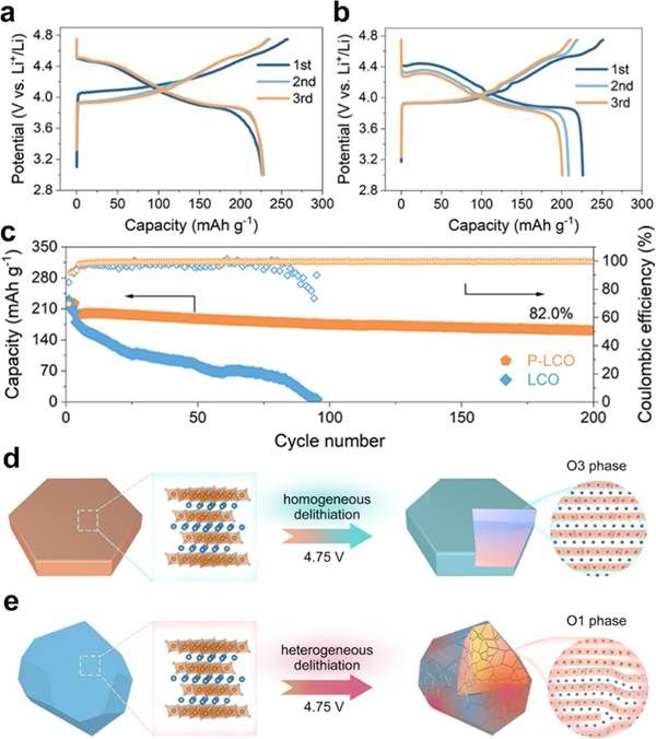 图5. 在3.0?4.75 V电压范围内对电化学性能的表征。(a) P-LCO正极和(b) LCO正极在0.2C倍率下的充放电曲线;(c) P-LCO和LCO正极在1C倍率下的循环稳定性;(d) P-LCO正极和(e) LCO正极中脱锂均匀性、结构演变、内部应力及退化机制之间相互关系的示意图。