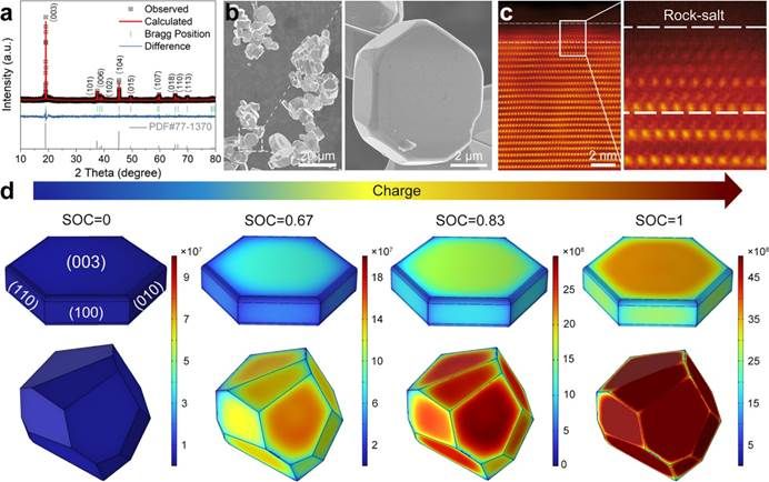 图1. P-LCO正极材料的结构与形貌特征。(a) P-LCO的精修XRD图。 (b) P-LCO的SEM图 (c) P-LCO的HAADF-STEM图像。(d) 通过有限元模拟研究P-LCO和LCO正极颗粒在充电过程中的应力分布情况。