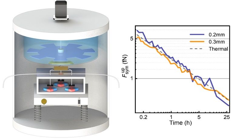 图1. 基于磁悬浮力学振子构建的第五种力精密测量系统(左)与力测量实验结果(右)