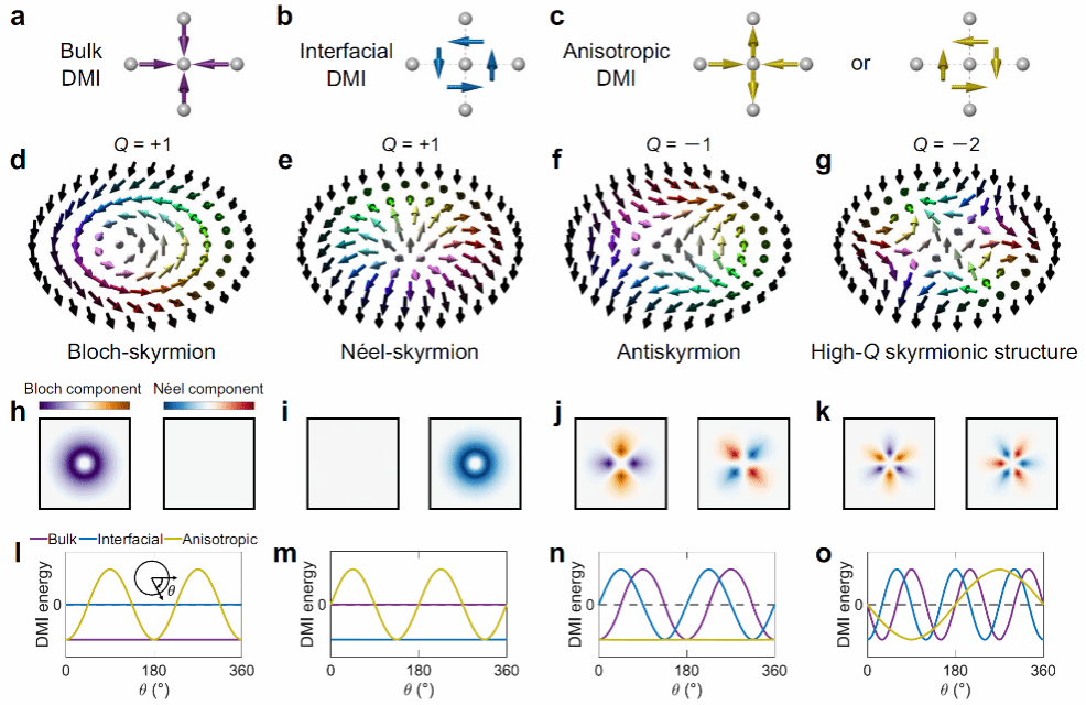 图1|各类DMI对不同斯格明子结构的稳定性分析。a–c:块体型、界面型和各向异性型DMI的DM矢量箭头方向示意。d–g:不同类型斯格明子(布洛赫型、奈尔型、反斯格明子、高阶斯格明子)对应的磁矩结构。h–k:对应结构的俯视图,展示奈尔与布洛赫分量。l–o:不同DMI类型下能量密度随方位角的变化关系,揭示其稳定性特征。