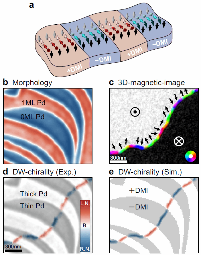 图2|非均匀DMI调控畴壁手性。a:非均匀DMI引起的局域畴壁手性变化示意。b:W(110)上Pd条带的LEEM形貌图。c:[Ni/Co]2/Pd/W(110)多层膜的合成SPLEEM彩图。d:从实验中提取的畴壁手性分布与形貌图叠加。e:基于实验形貌设定DMI分布的模拟结果,验证手性调控机制。