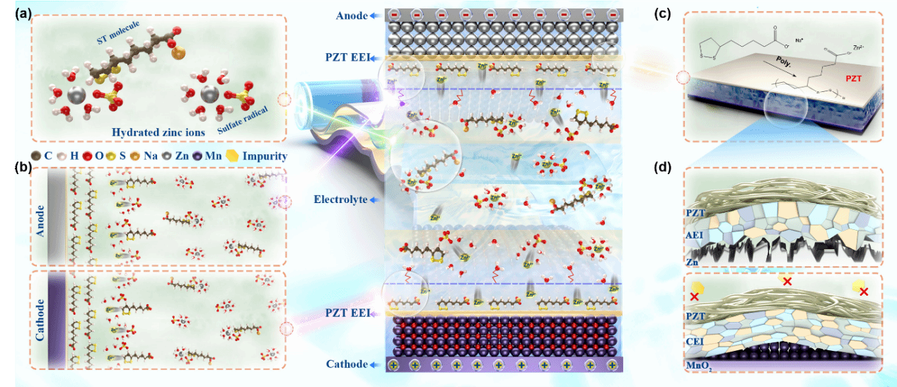 近日,凯发k8官网姚亚刚教授团队提出了一种简便且可规模化的工程策略,通过在ZnSO?电解液中引入硫辛酸钠(ST)分子,在电极与电解质之间构建稳定的双层界面。ST分子具有良好的亲锌性,首先通过调控水合Zn??离子的溶剂化结构,部分置换其水合鞘中的H?O分子,从而优化电解液环境,有效抑制腐蚀并削弱析氢反应。随后,ST阴离子在Helmholtz内层上的特异吸附重构了电双层结构,促进Zn??的脱溶,并通过其捕获Zn??的能力实现界面电荷分布的均匀化。在吸附过程中,界面上的ST分子发生原位聚合,形成由ZnS–有机无定形内层和聚合态硫辛酸锌外层组成的双层结构。其中,内层调节Zn??的离子通量,外层则增强界面的机械强度。值得一提的是,ST分子中的二硫键可发生动态断裂与重组,使聚合界面具备自修复能力,能够修复损伤,并进一步提升电极-电解质界面的自调节性与适应性。凭借这一独特设计,ST增强的锌对称电池在60mAcm??高电流密度下实现了长达7800圈的超长循环寿命;同时,组装的锌锰全电池在2000mAg??下经过10,000圈循环后容量衰减率仅为0.0014%。这一双层界面工程策略为实现长寿命锌锰全电池的发展提供了重要突破。