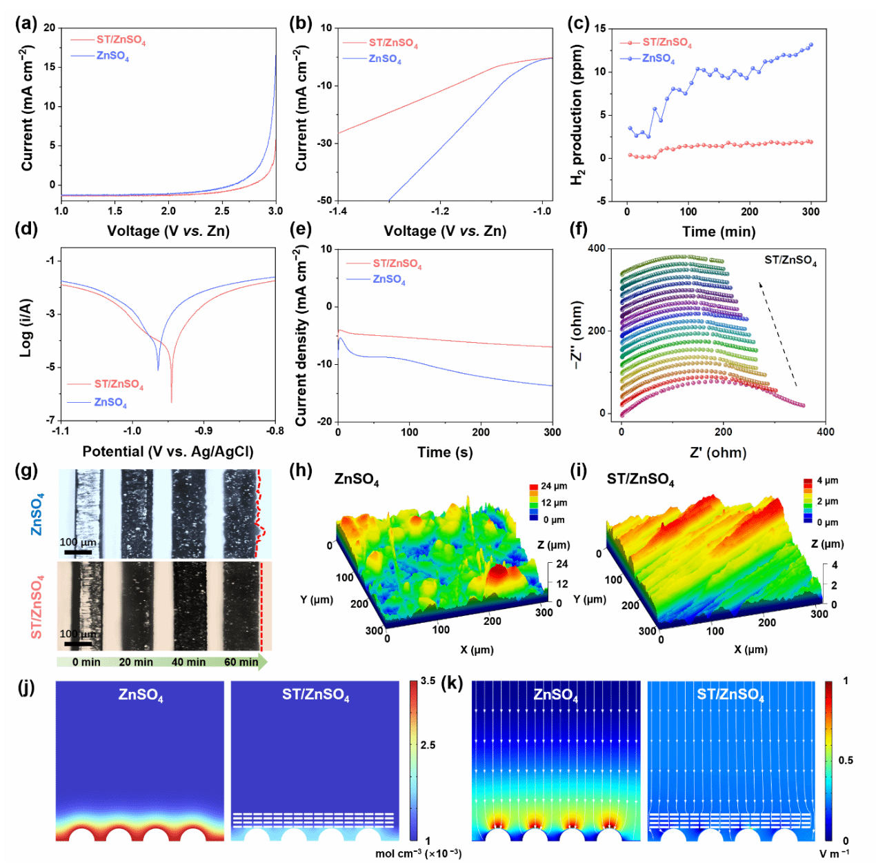 图4所示展现了ST分子抑制了锌腐蚀,析氢等副反应,促进了稳定电极界面的形成,诱导了锌均匀沉积,实现了平整均匀的锌沉积形貌,从而延长了锌负极的使用寿命。
