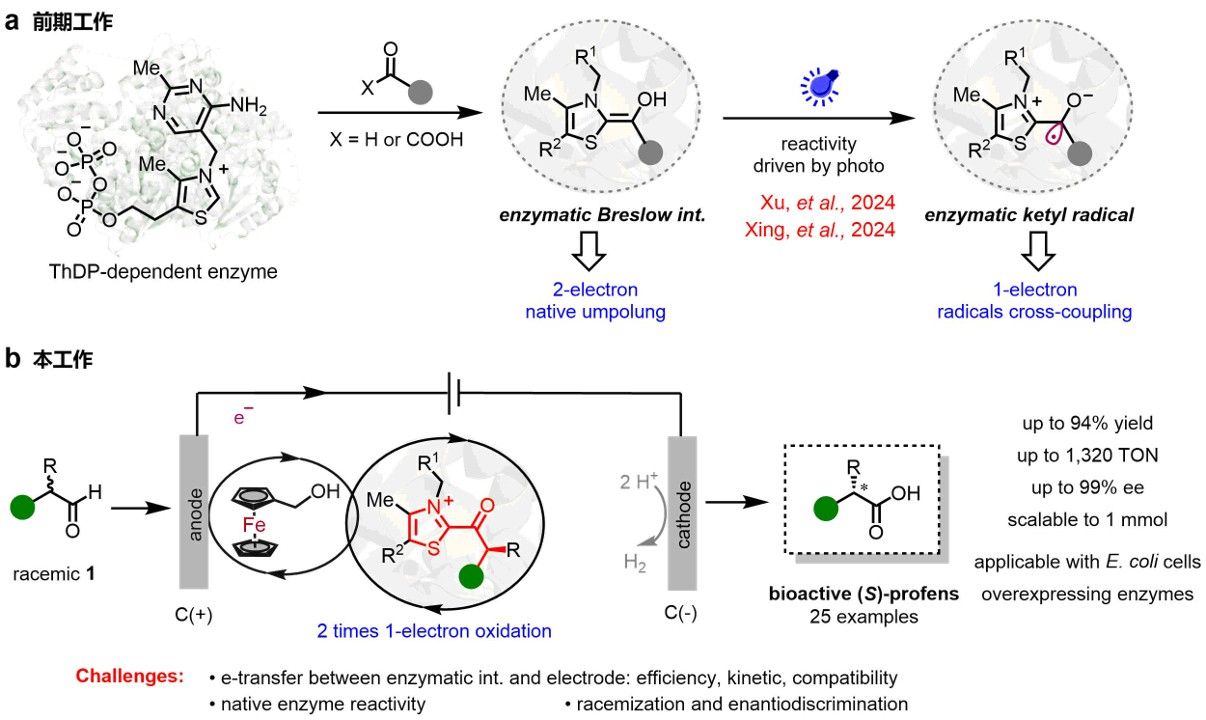 我校黄小强研究员,自2021年开展独立研究以来,通过酶学机制设计和蛋白定向进化改造策略,成功开发了几类新酶催化功能。在光酶催化领域,黄小强团队首创焦磷酸硫胺素(ThDP)依赖的自由基酰基转移酶(Nature 2024, 625, 74:凯发k8官网黄小强/梁勇及合作者《Nature》发文:创制新光酶元件,引领光生物制造新方向;Nature 2025, 637, 1118:凯发k8官网黄小强团队《Nature》:推动光酶领域到复杂多组分转化),突破了不对称生物合成的边界。在此基础上,团队在不对称电酶催化领域取得新突破:融合二茂铁甲醇介导的阳极氧化和ThDP依赖酶催化,解锁了电酶催化的动态动力学氧化新体系(图2)。团队开发的电酶协同催化策略,创新性地将2次单电子氧化机制引入酶中,结合定向进化技术优化蛋白的活性中心,最终成功赋予了ThDP依赖酶催化动态动力学氧化的新活性。该体系以清洁电能替代传统化学氧化剂,可在较低酶负载量下(0.05 mol%),实现布洛芬、萘普生等十种(S)-芳基丙酸类抗炎药物的高效合成,对映选择性高达99% ee,并兼容全细胞催化与规模化制备。