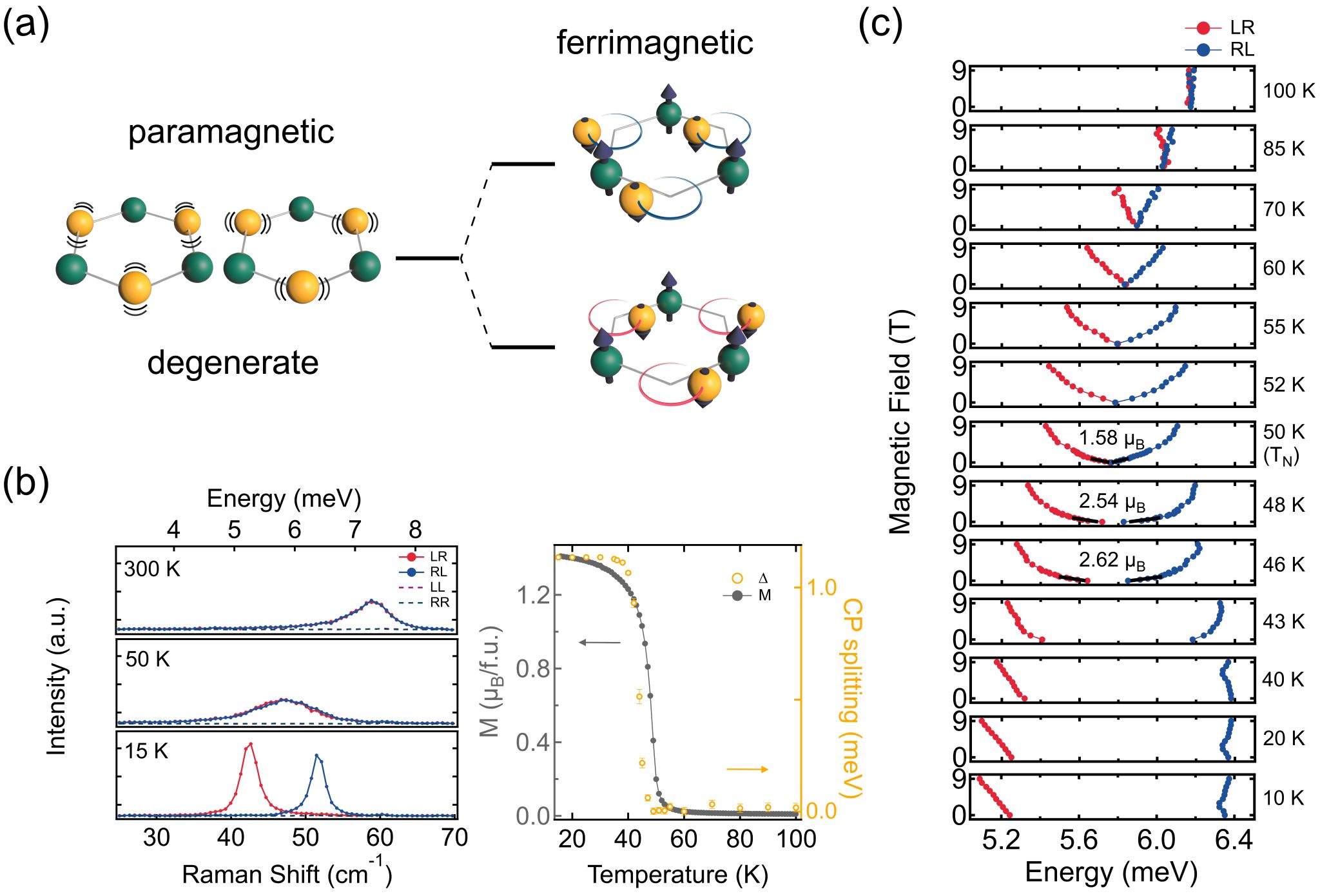 1 a)亚铁磁序诱导的手性声子;(b)左图:一些特征温度下不同圆偏振激发-探测通道的拉曼光谱;右图:手性声子劈裂随温度的变化与磁化随温度的变化对比;(c)不同温度下手性声子频率的磁场依赖关系。